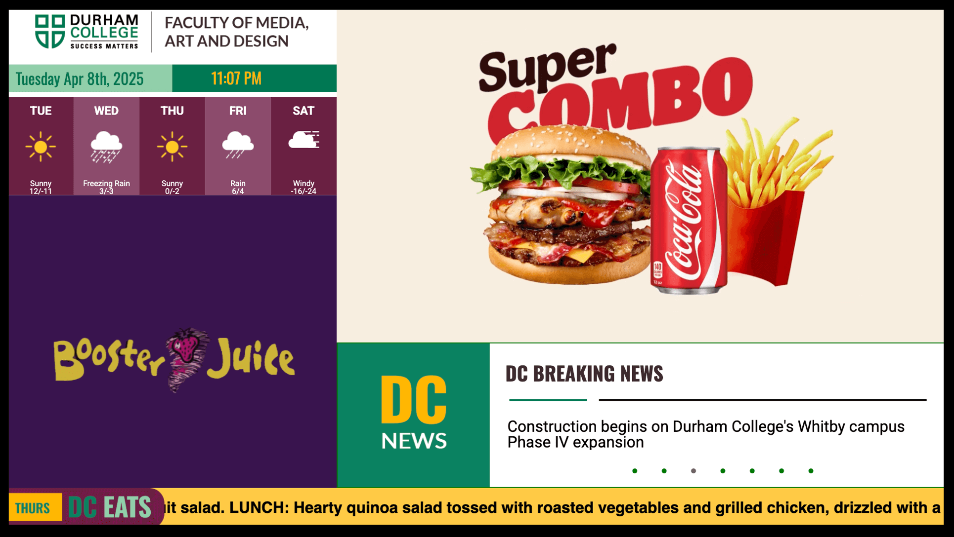 This digital signage system was developed for the flat screen displays throughout Durham College's campus, providing students, staff, and visitors with a range of useful information. It showcases real-time updates such as the current time, date, weather, daily menu offerings, advertisements, and other important announcements. With the constant flow of people on campus, this signage serves as an efficient way to communicate relevant details to a diverse audience. As digital signage continues to gain popularity worldwide, this system offers a versatile solution that caters to various needs and backgrounds.